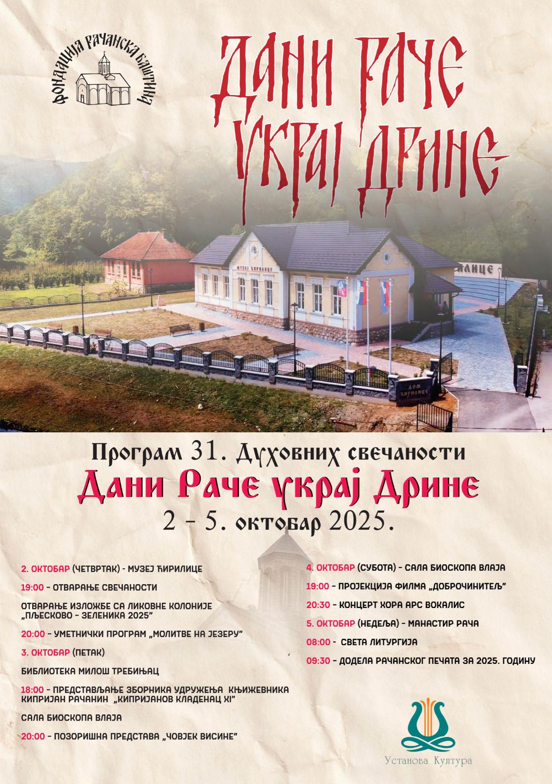 У недељу, 5. октобра, након Свете литургије у манастиру Рача, биће уприличен и најзначајнији догађај манифестације, свечана додела Рачанског печата за 2025. годину.